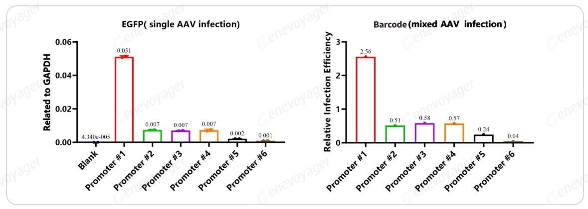 将候选启动子(每种启动子对应一种特定的Barcode)与EGFP报告基因使用适合的衣壳AAV载体进行包装,然后将其1:1混合感染293T细胞或小鼠,取细胞或目标组织样并提取总RNA,通过qPCR检测EGFP及各启动子对应Barcode的表达水平,筛选出最佳启动子。
