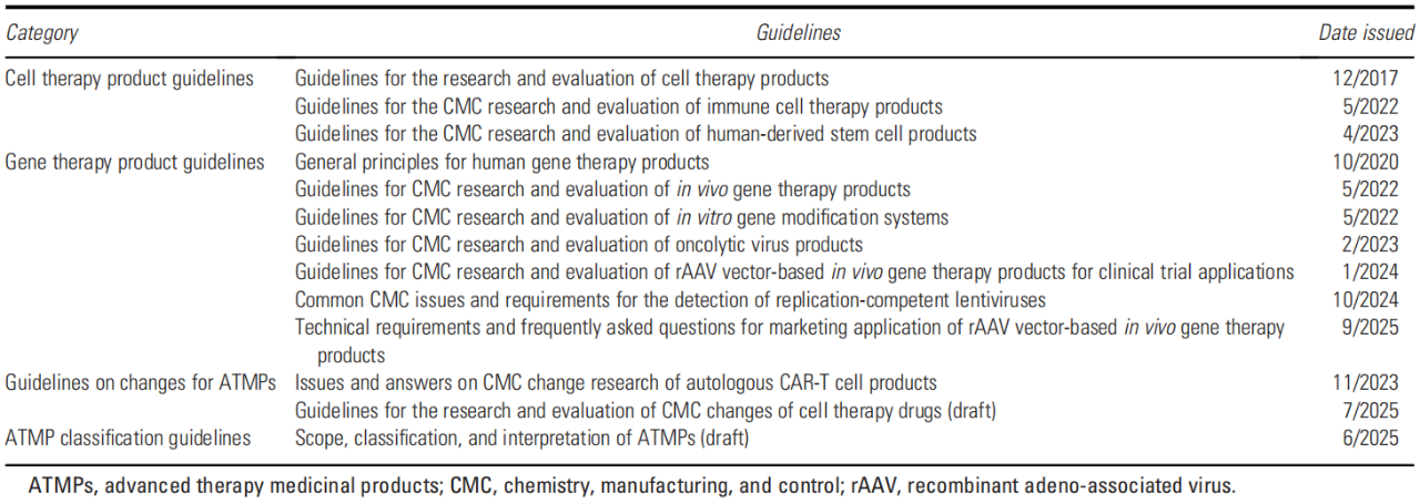 中国先进治疗药物的研发正快速发展,自2018年以来,上市申请和临床试验申请数量持续增长。随着基因递送载体和基因编辑工具等生物技术的快速发展,先进治疗药物为许多罕见遗传病和常见难治性疾病带来了新希望,并在临床试验中不断取得进展。过去几年间, 国家药品监督管理局(NMPA)陆续发布了系列技术指南,有效规范和指导先进治疗药物的研发、生产和应用(表1)。这些药学生产质量管理规范(CMC)指南建立了一套有利于中国先进治疗药物发展的监管体系。