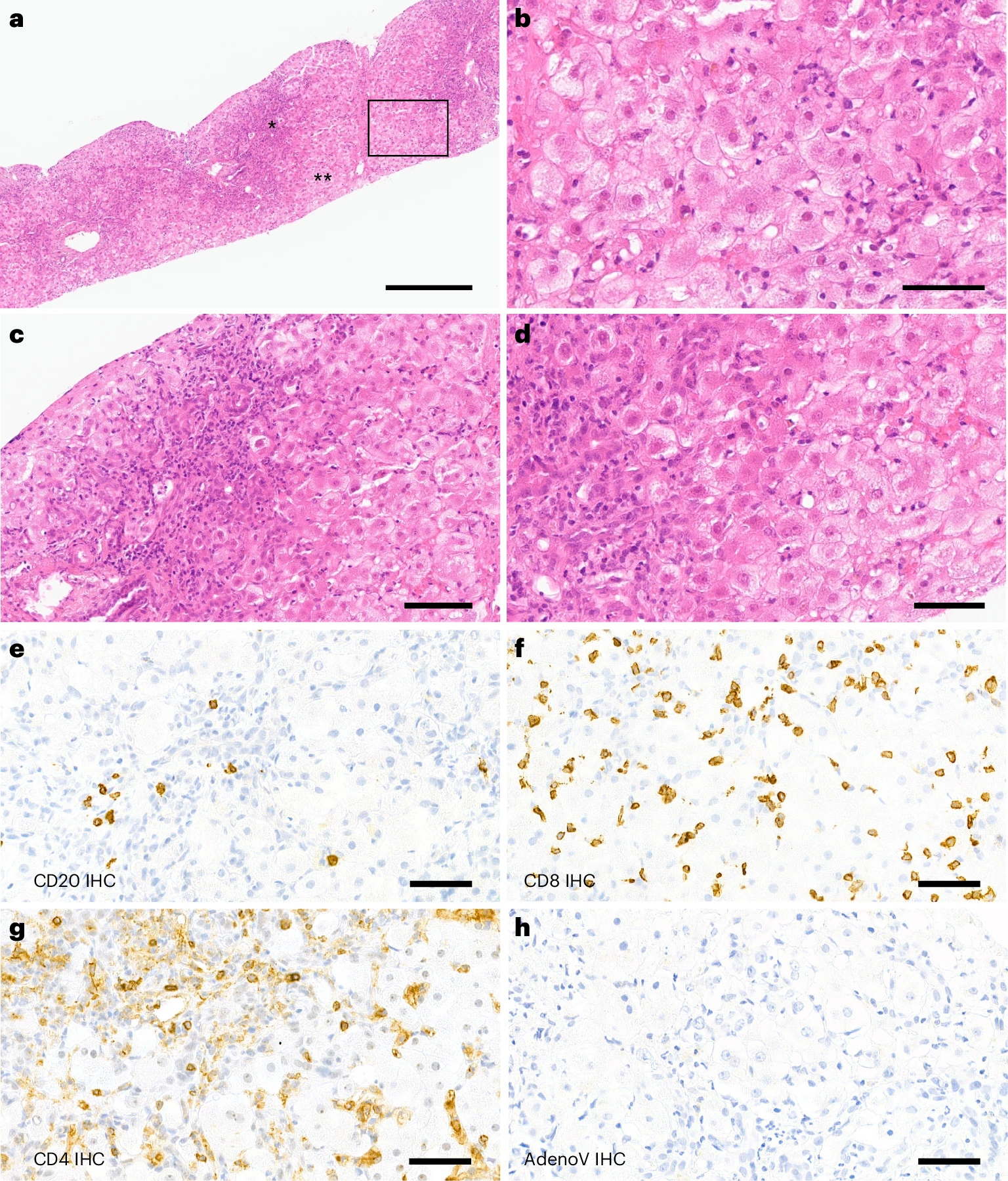 该研究的对象是一名7岁女性患者,该患者患有1型脊髓性肌萎缩症且接受了AAV基因疗法(Onasemnogene abeparvovec【OA】)治疗。OA由HEK 293系统生产,使用三种质粒:载体质粒(pSMN,其中包含SMN及其表达所需的元件);包装质粒(pAAV2/9,其中包含 AAV2 复制基因【rep】和 AAV9 衣壳基因【cap】);以及辅助质粒(pHelper,其中包含 AAV 复制所需的腺病毒【HAdV】基因)。患者输注时体重超过20公斤,因此需要2.2×1015个载体基因组的高剂量载体。患者随后出现肝炎症状;血清肝功能标志物提示肝损伤,在输注后7周达到峰值。肝穿刺活检结果显示出与既往报道的野生型AAV2感染相关儿童肝炎和“病因不明”的儿童急性肝衰竭一致的组织学特征。