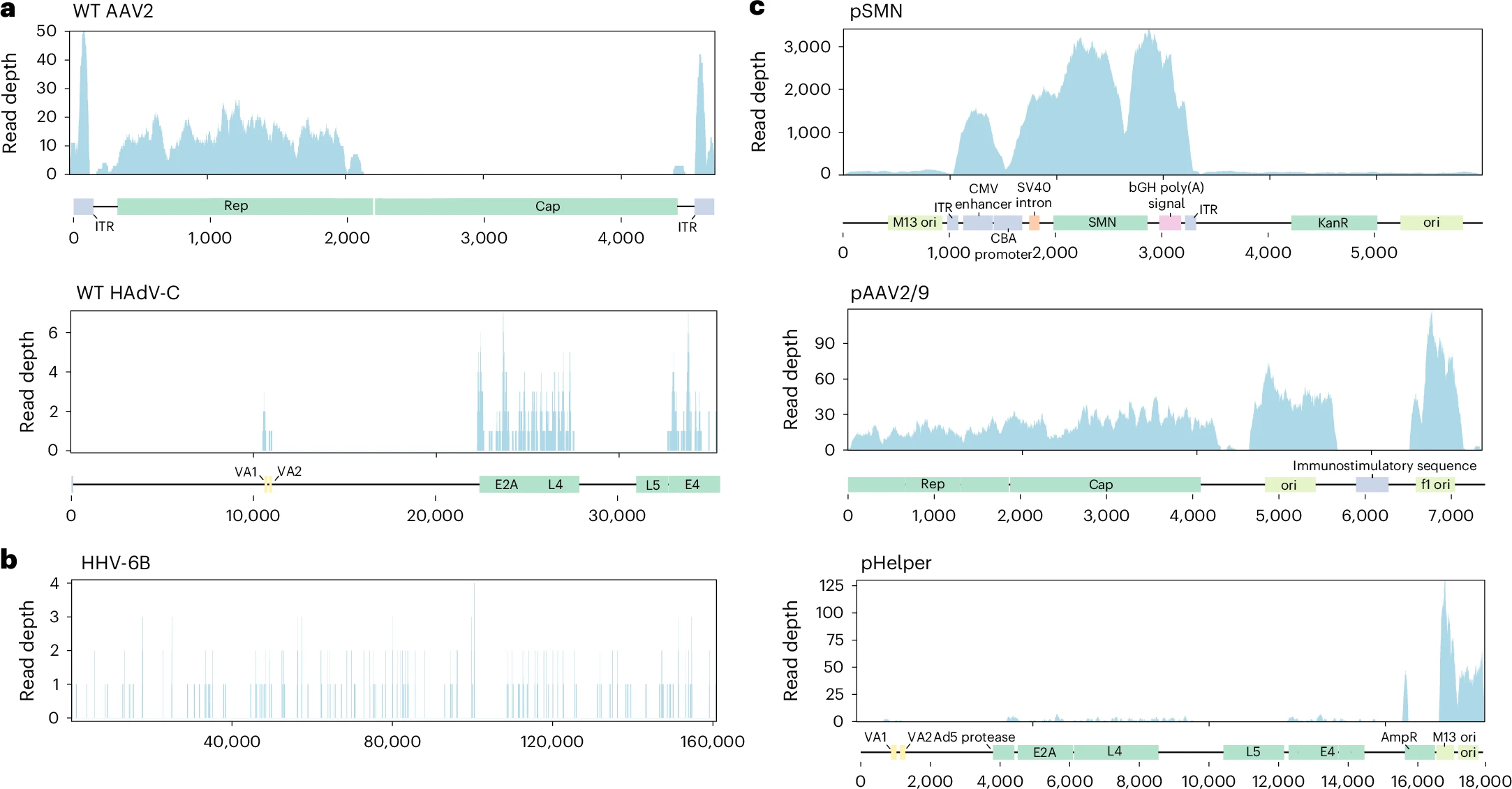 研究者们对剩余患者肝脏样本中的DNA和RNA进行了非靶向短读长宏基因组测序。在DNA测序分析中,将非人类序列初步鉴定为最可能的微生物物种,结果显示存在多种AAV血清型,主要是AAV2,以及人乳头瘤病毒C(HAdV-C)和人β疱疹病毒6B(HHV-6B),且鉴定结果表明存在自然HHV-6B感染,而AAV2和HAdV并非来源于野生型病毒感染(图3a)。为了进一步探究,研究者们将测序读段比对至OA生产所用的质粒序列,结果发现OA载体基因组覆盖良好,pSMN 质粒骨架和pAAV2/9也得到了良好的覆盖,部分读段比对至pHelper质粒(图3c)。最初被分类为AAV2或HAdV-C的读段仅比对至OA生产质粒所包含的病毒基因组片段(AAV2 rep、HAdV E4、E2A、L4和VA区),提示肝组织中存在质粒序列而非野生型病毒感染(图3a)。研究者们将肝脏样本的reads与AAV1-9基因组进行比对,发现最佳比对序列为AAV2的rep基因和AAV9的cap基因,这与pAAV2/9的嵌合结构(AAV2 rep基因和AAV9 cap基因)相符。对长读长宏基因组DNA数据的分析也得到了类似的结果:初步分类鉴定出AAV、HAdV和HHV-6B,但后续比对显示序列与所有三种生产质粒均相符。