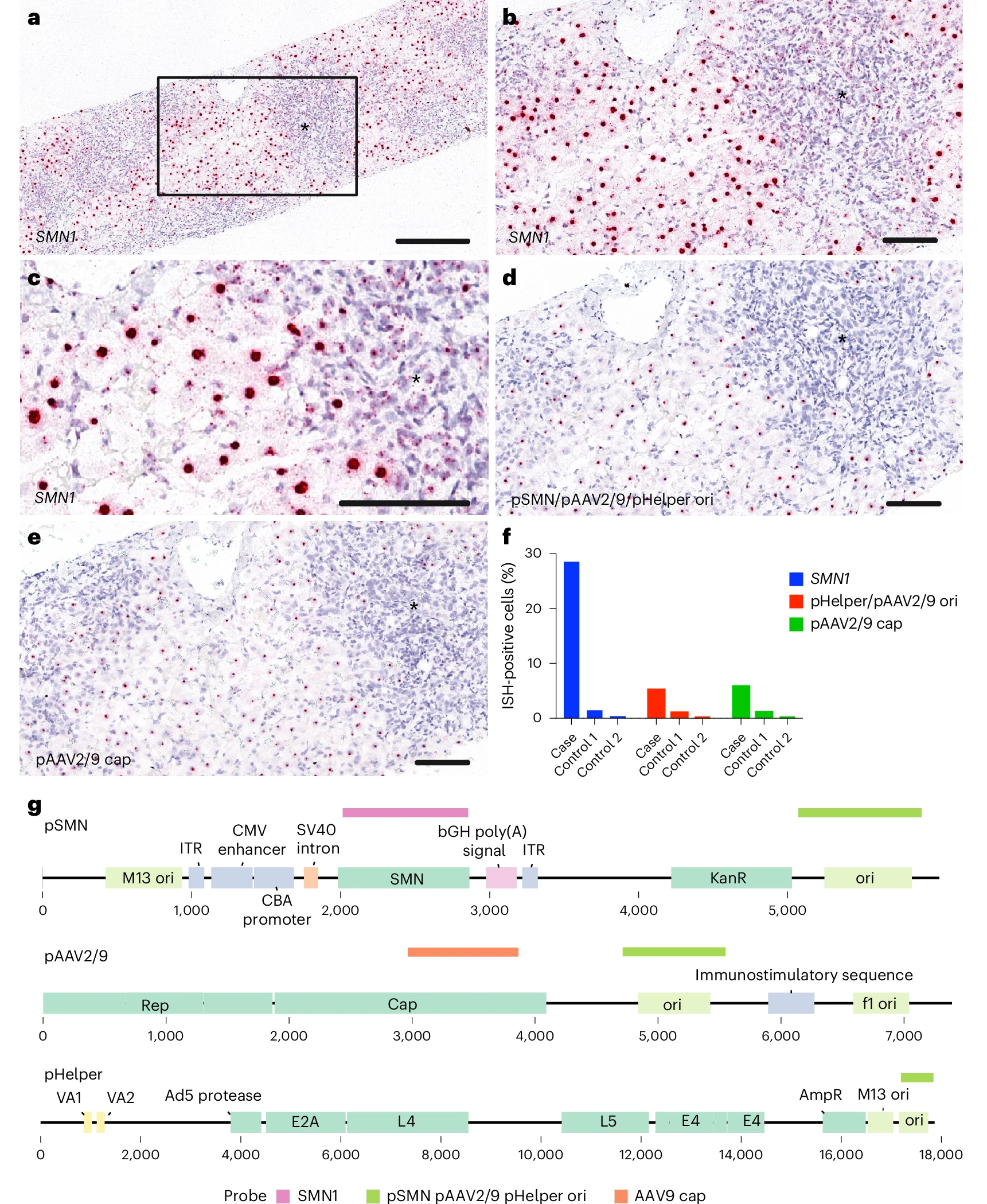 原位杂交分析证实,在5.1%的细胞中检测到pSMN、pHelper和pAAV2/9质粒的细菌复制起点,以及在5.8%的细胞中检测到pAAV2/9质粒的AAV9 cap基因序列(图4)。污染质粒特异性序列的含量低于SMN,这与宏基因组测序结果一致。