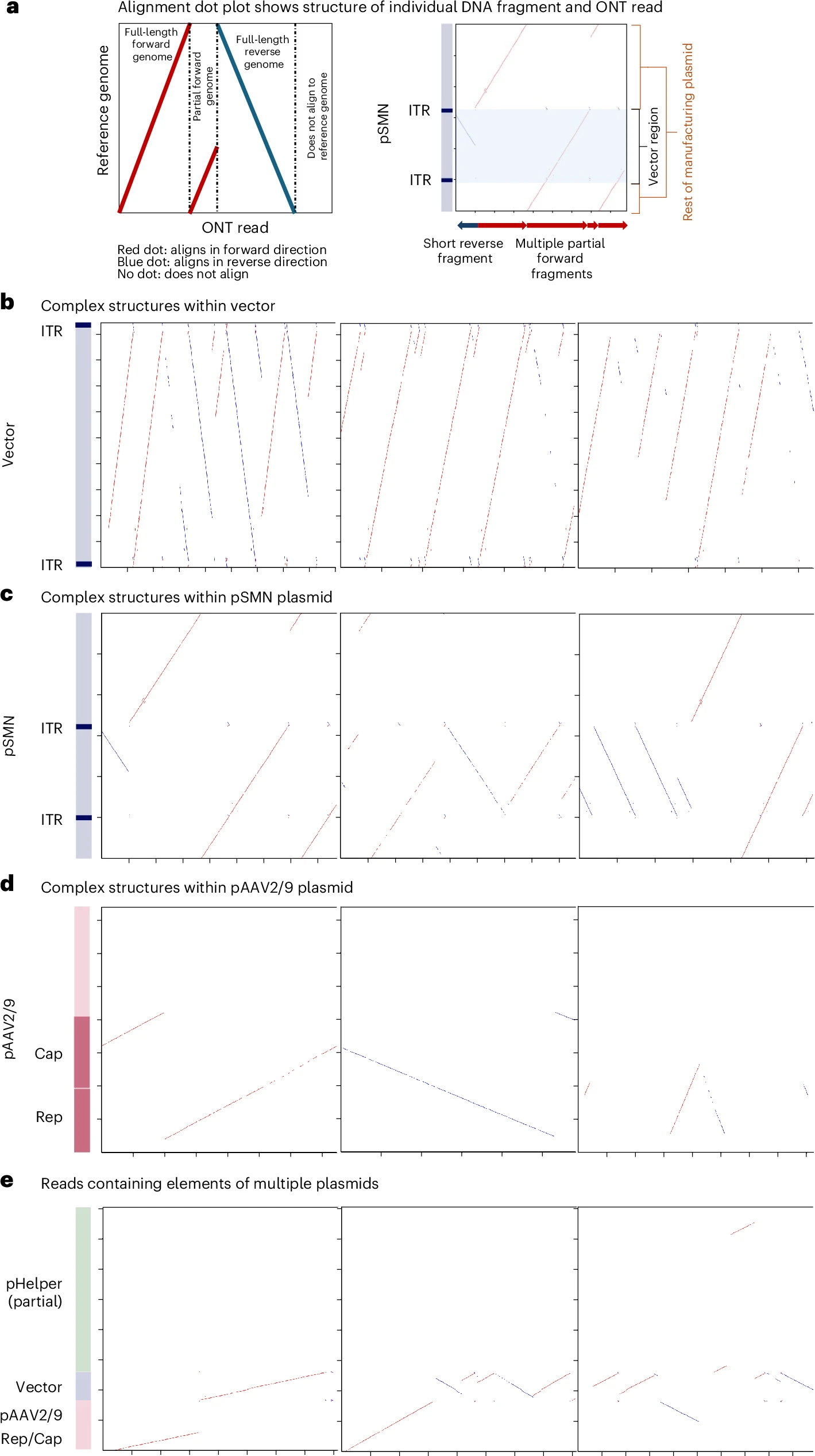 研究者们对长读长测序的单个读段进行了详细的序列分析,结果显示,载体基因组存在高度串联化和复杂的基因组结构,并伴有重排(图5a-d)。观察到的串联模式,包括头对头、头对尾和交替重复,与使用滚环扩增和滚环扩增技术复制AAV时观察到的模式相似。质粒读段往往并非代表完整的质粒,而是质粒序列片段与载体基因组的组合。大多数pAAV2/9读段还包含其他生产质粒的区域,表明质粒之间存在重组(图5)。由于生产过程中包含了纯化步骤,重排序列可能来源于载体颗粒外的重组质粒污染物、生产过程中包装错误的重组DNA和/或输注后的重组事件。观察到的许多结构长度都超过了AAV载体的最大包装长度(高达15 kb,而包装极限约为5 kb),这表明一些重组可能发生在体内。研究者们还通过短读长宏基因组学分析,在DNA水平上鉴定出了大量载体内部重排。对比对到pSMN质粒的嵌合DNA序列进行分析,发现载体基因组中存在大量载体-人源连接点,包括少量位于质粒骨架的连接点,揭示了AAV可能整合到宿主基因组中。