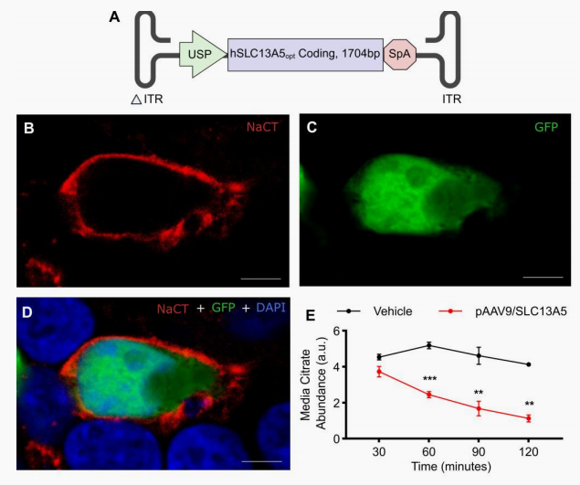 体外功能验证:该载体被包装在具有广泛中枢神经系统趋向性的AAV9衣壳中。在体外人类细胞测试中,该载体成功使NaCT定位于细胞膜(图1B-D),并在2小时内将培养基中的细胞外柠檬酸丰度降低了约70%(图1E),证实了转运功能的成功恢复。