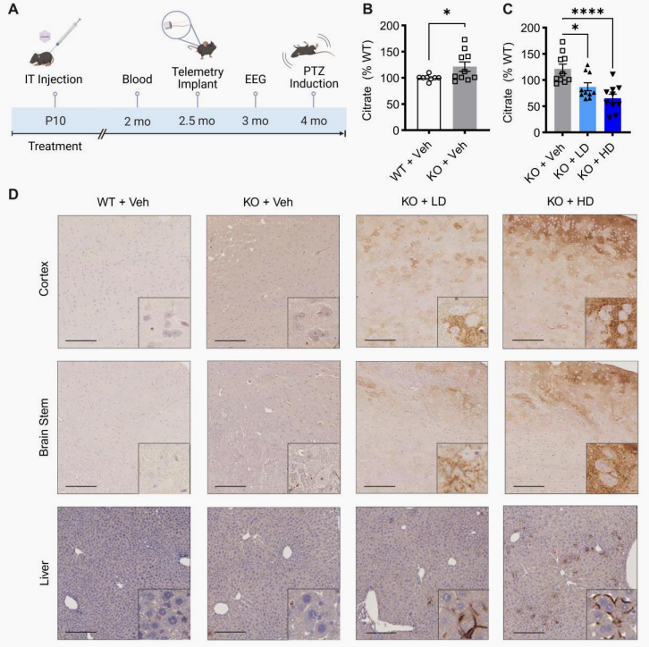 研究团队使用敲除Slc13a5基因的小鼠(KO小鼠)进行了体内药效学评价。在小鼠出生后第10天(P10),研究人员通过鞘内注射(IT)递送了低剂量(2×1010vg)或高剂量(8×1011vg)的AAV9/SLC13A5。