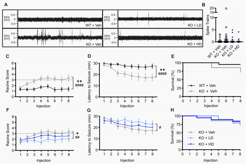 癫痫遏制:基因治疗显著减少了小鼠大脑中的异常癫痫样放电棘波序列(图3B)。在戊四唑(PTZ)诱发测试中,治疗组小鼠的癫痫发作严重程度显著降低,发作潜伏期大幅延长。在8次PTZ诱导后,未治疗的KO小鼠死亡率达29%,而基因治疗有效保护了小鼠,极大降低了致死率(图3H)。
