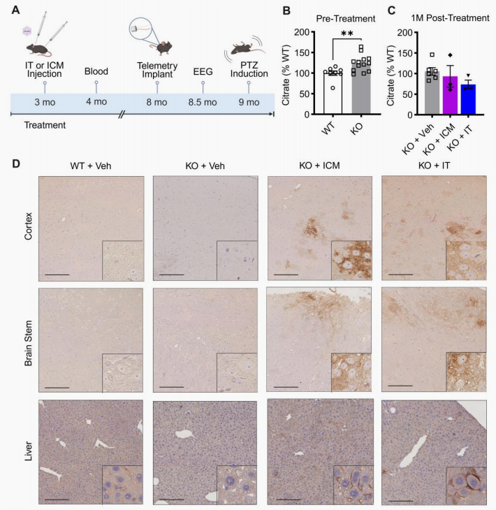 图2 在Slc13a5 KO小鼠出生后第10天(P10)进行脑室内(IT)注射AAV9/SLC13A5后,小鼠大脑中钠-柠檬酸共转运体(NaCT)表达显著增强,且血柠檬酸水平下降。(图片来源:Bailey LE et al, J Clin Invest., 2026)