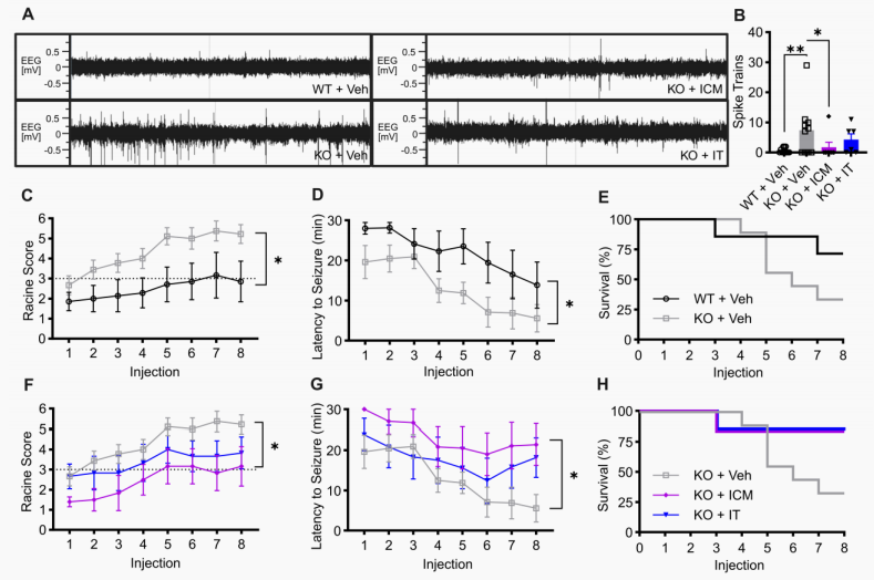 癫痫逆转:ICM途径递送的基因疗法完美地将成年KO小鼠异常的脑电活动恢复到了野生型正常水平(图6A)。成年期干预显著降低了PTZ诱发的癫痫严重程度,ICM和IT两种途径均将癫痫相关死亡率大幅控制在了17%(图6H)。