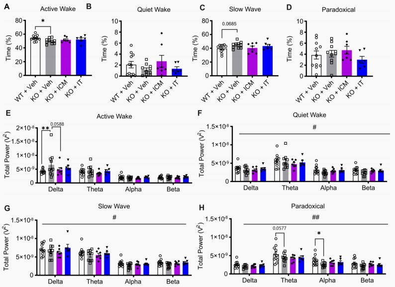 睡眠生理改善:8个月大的老年KO小鼠表现出清醒时间过少、慢波睡眠过多的异常 。基因治疗呈现出增加主动清醒时间的趋势,其中脑部转导率更高的ICM途径极为有效地降低了清醒期的异常慢波(Delta波)活动(图7E)。