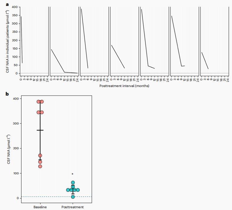 研究显示,完成检测的患儿在治疗后脑脊液中NAA均明显下降,提示ASPA相关代谢异常得到了有效纠正。结合脑内MRS结果,研究者认为,这种变化并非短暂波动,而更可能反映了治疗后酶功能的持续恢复。对于卡纳万病这样的代谢性白质病来说,这一点非常关键,因为它说明治疗确实打到了疾病核心。