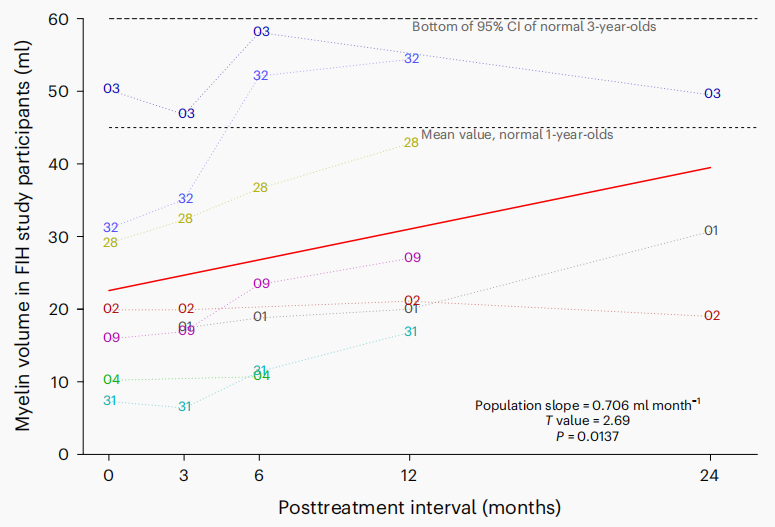 比代谢改善更令人振奋的是,研究还在影像学层面观察到了髓鞘体积增加。研究者利用SyMRI对全脑髓鞘进行定量分析,发现治疗后患儿髓鞘体积总体呈显著上升趋势,线性混合效应模型分析得到的人群斜率为0.706ml/月,P=0.0137;与基线相比,6个月和12个月时均达到统计学显著性。