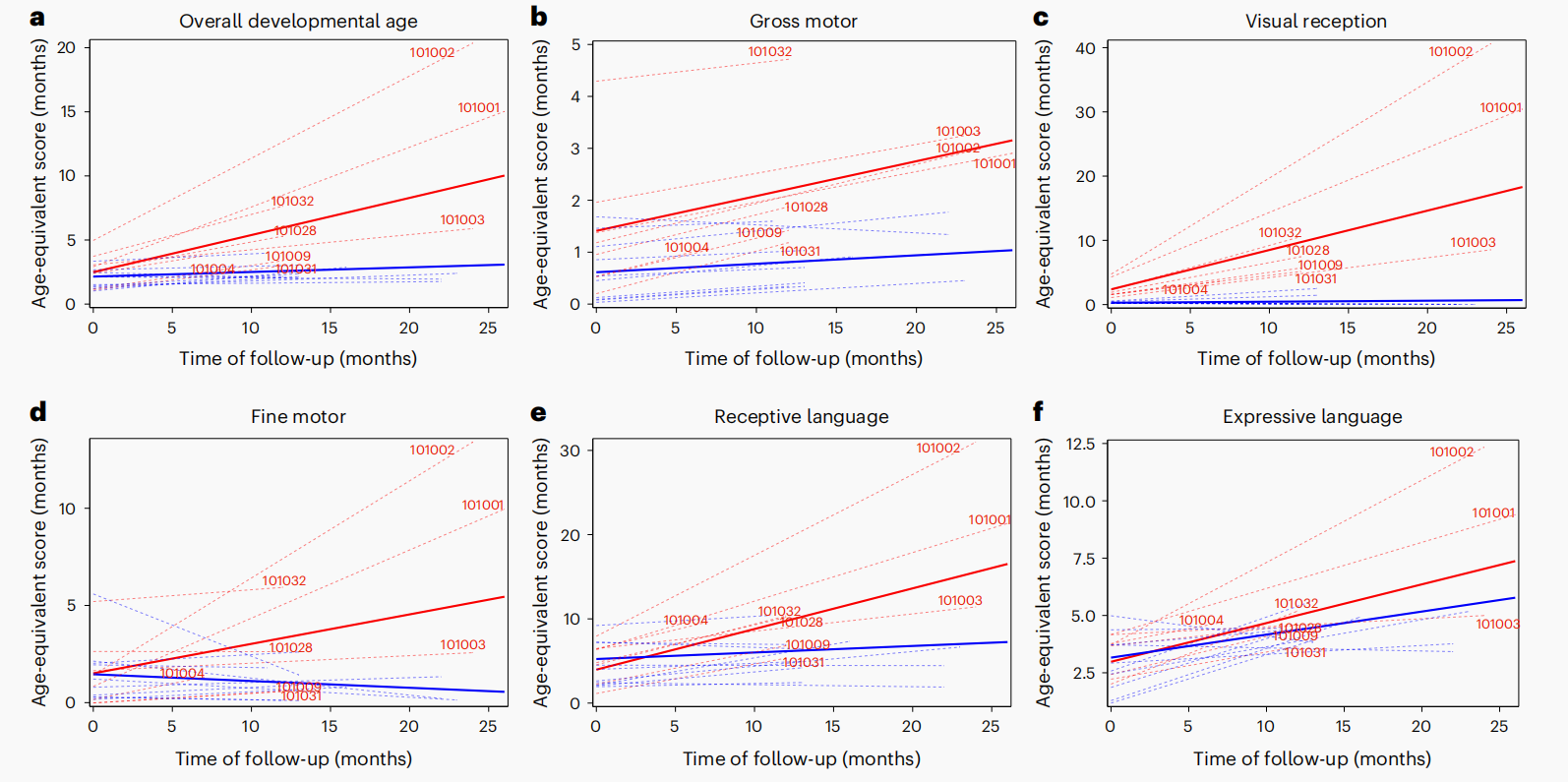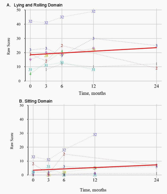 相比之下,粗大运动和表达语言目前还没有达到统计学显著性。GMFM-88结果也类似,多数患儿的改善主要体现在较基础的运动功能上,如躺卧翻滚和坐姿。