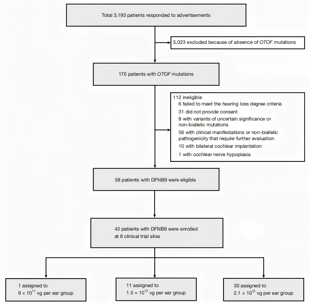 为了全面评估基因疗法的安全性和有效性,本研究在国内8家临床中心共筛选了3193名患者,最终纳入42名符合条件的DFNB9患者(图1)。