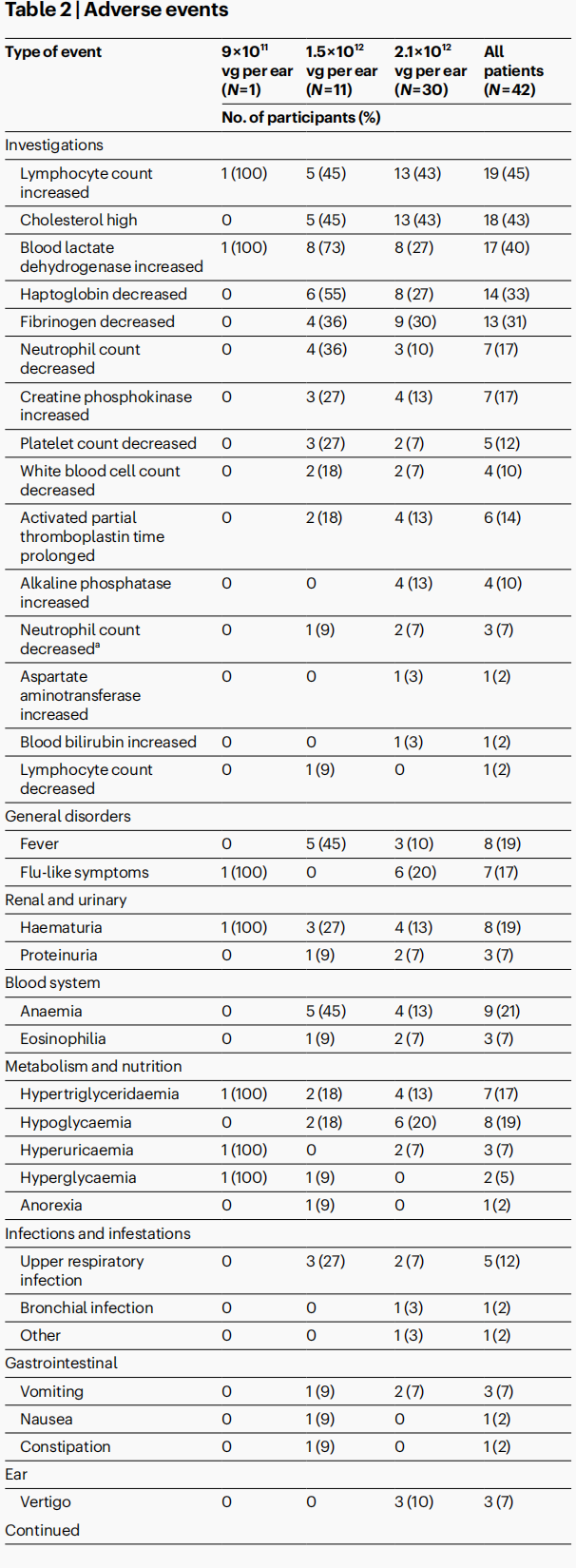 ● 安全性是该临床试验的首要评估终点。研究结果表明,接受AAV1-hOTOF治疗的42名患者在治疗后6周内均未出现任何剂量限制性毒性(DLT)。