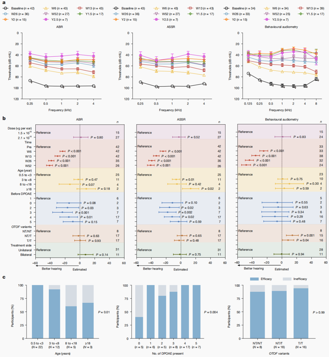 入组患者年龄跨度极广(0.8-32.3岁),他们分别接受了三种不同剂量的AAV1-hOTOF内耳注射治疗,随访时间最长达到2.5年。