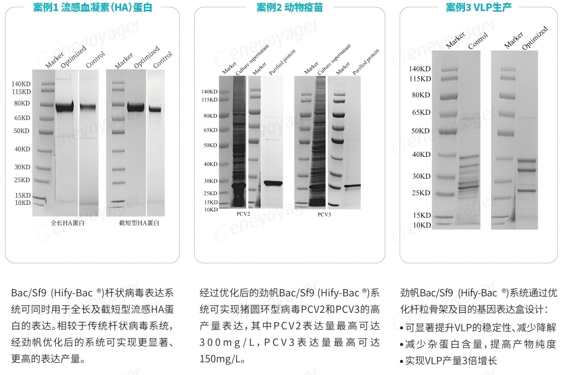 劲帆Bac/Sf9(Hify-Bac ®)系统已在人用疫苗、动物疫苗的生产中进行测试,展现出高产、快速表达和可规模化生产的优势。