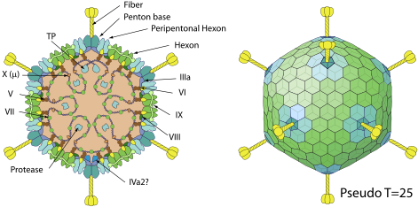腺病毒(Adenovirus,AdV)是一种无包膜的、直径约为70-90 nm的双链DNA病毒(图1),其基因组大小约为36kb,分为早期(E1A,E1B,E2,E3,E4)、中期(IVa2,pIX)和晚期(L1-L5)转录单元(图2)。腺病毒有50多种血清型,其中的常用血清型为Ad5。腺病毒具有组织嗜性和感染分裂和非分裂细胞的能力,常用的AdV载体分为条件复制型(Conditionally Replicating Adenovirus,CRA; oAd)和复制缺陷型腺病毒(Replication-defective Adenovirus)载体,广泛应用于预防性疫苗、治疗性疫苗以及溶瘤病毒领域。