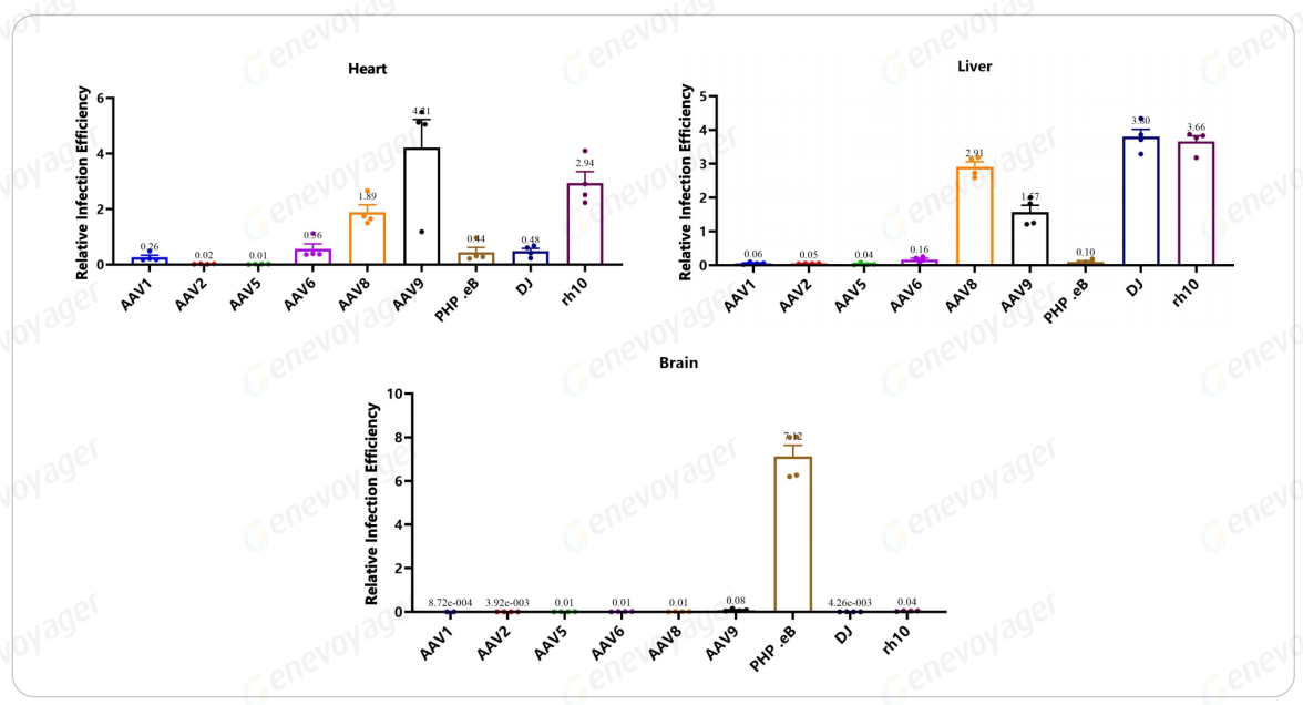将候选AAV衣壳1:1(每种衣壳含有不同barcode)混合感染293T细胞或小鼠,取细胞或目标组织样并提取总RNA,通过qPCR检测不同衣壳AAVbarcode的表达水平,筛选最佳AAV衣壳。