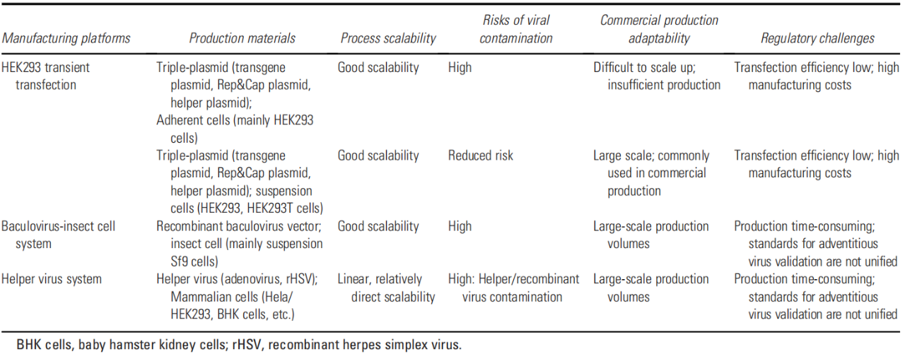 目前,有三种常用的rAAV制造平台已经经历了显著的发展和优化:(1)HEK293细胞中的三质粒瞬时共转染系统。(2)Sf9细胞中的杆状病毒-昆虫细胞系统。(3)辅助病毒生产系统。表2对比了三种平台生产的rAAV产品在可扩展性、监管挑战、病毒安全性风险及商业适用性方面的表现。