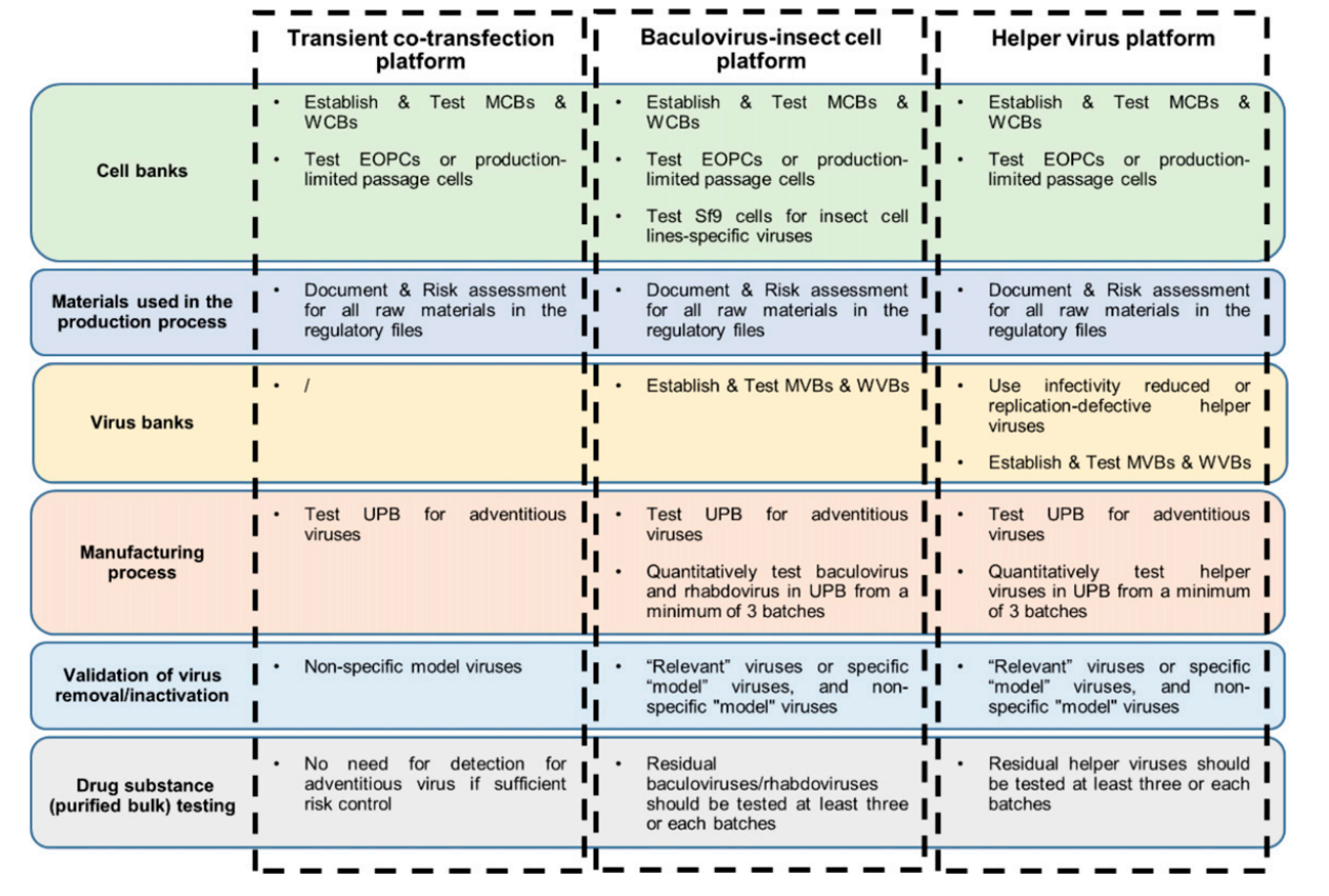 产品中外源病毒的检测要求与杆状病毒-昆虫细胞生产工艺相同,唯一区别在于需检测的病毒类型。对于辅助病毒生产工艺,如rHSV和AdV等辅助病毒可能构成潜在污染风险。