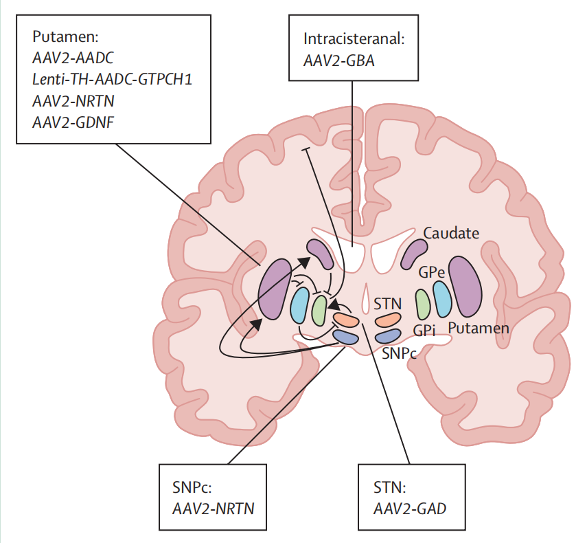 对帕金森病中神经环路功能障碍的理解和建模能力,促使人们实施了将基因靶向递送至特定脑区的临床试验,旨在通过改变神经递质信号传导和恢复正常神经环路来克服目前获批疗法的局限性。