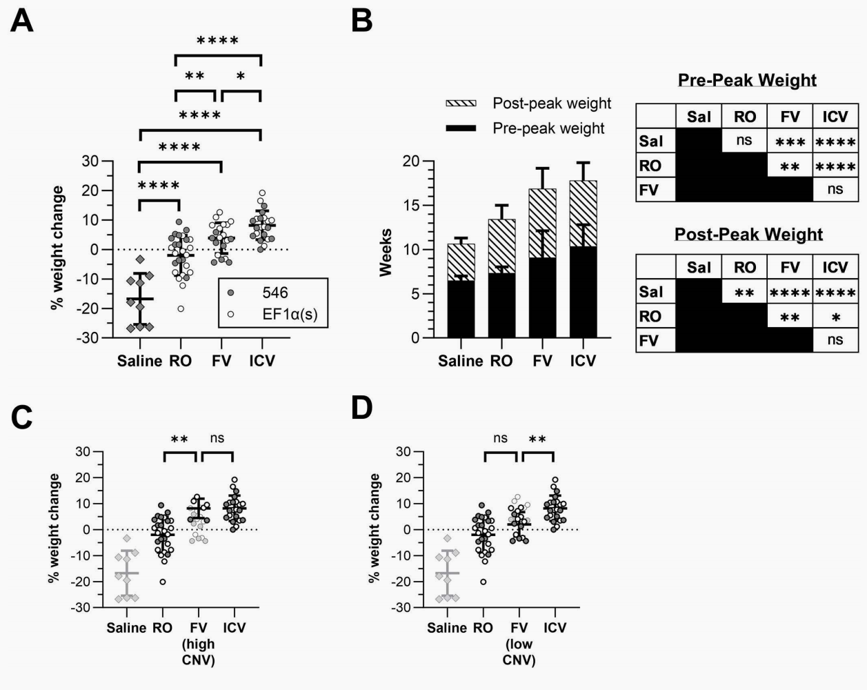 中位生存期对比(Fig 2A):未经治疗的生理盐水(Saline)对照组中位生存期仅为10.6周。断奶期给药的RO组提升至13.5周。而新生期给药的FV组和ICV组,中位生存期分别大幅跃升至16.1周和17.3周。