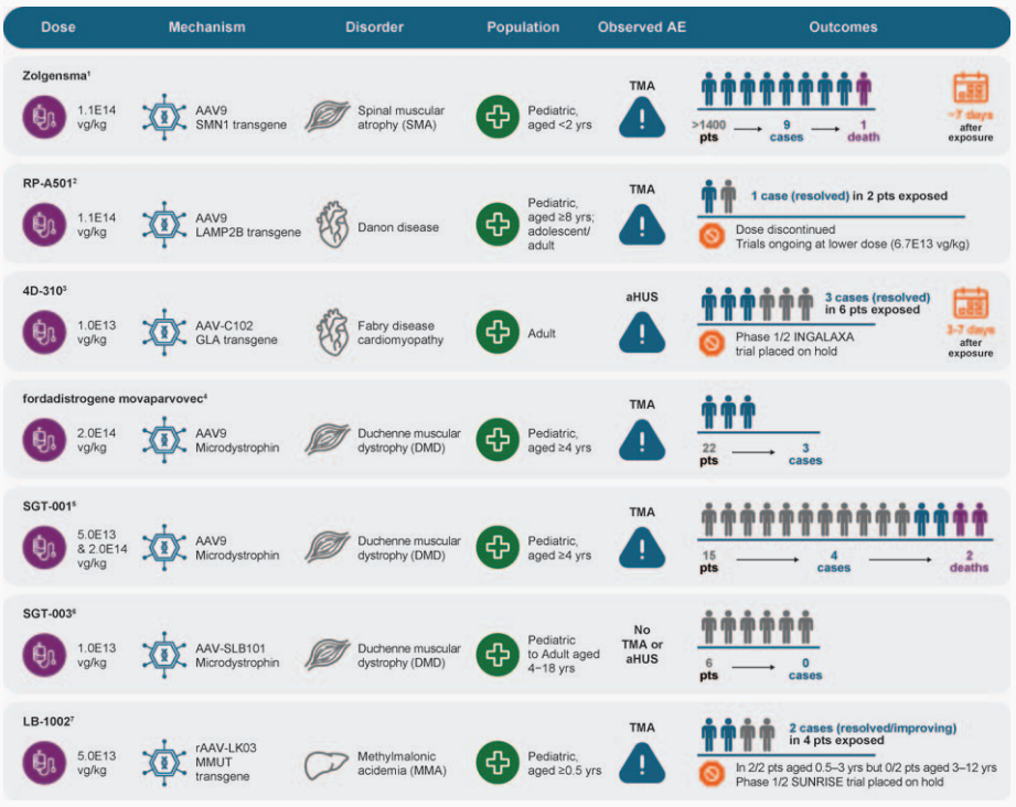 惊人的临床反差在于,这些致命的系统性免疫风暴,大多发生在我们认为“最安全”的、已排除高滴度预存抗体的患者群体中(详见图1)。例如,针对脊髓性肌萎缩症(SMA)的重磅管线Zolgensma,在超1400名患者中报告了9例TMA及1例死亡;针对杜氏肌营养不良症(DMD)的早期管线SGT-001,在15名受试者中出现4例TMA和2例死亡。