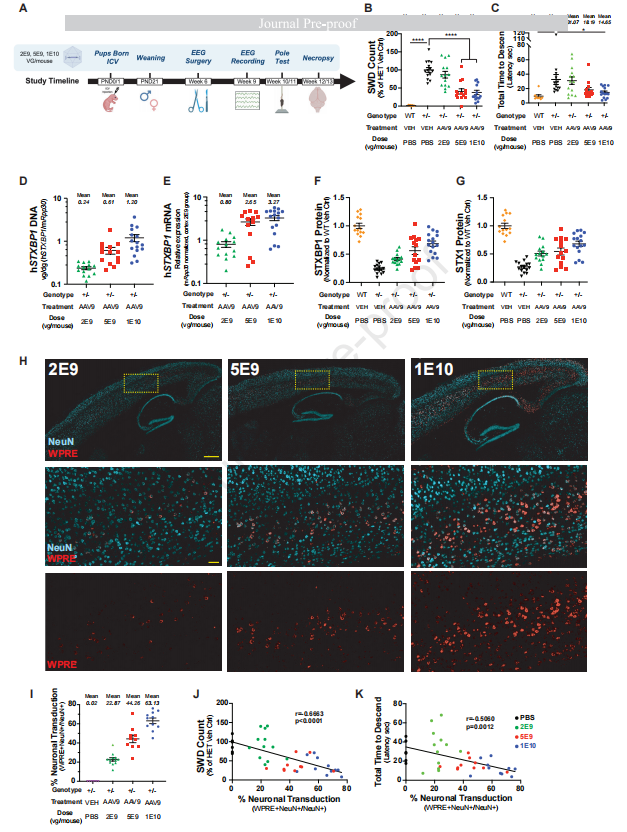 图4 通过AAV9-hSyn-STXBP1剂量梯度试验,明确了挽救Stxbp1杂合缺陷小鼠癫痫与运动表型所需的皮层神经元转导最低阈值