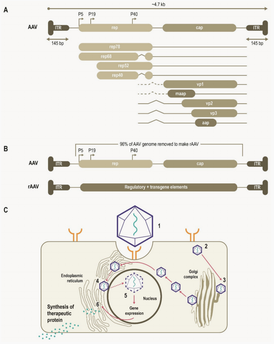 1 AAV基因组、AAV生命周期和通用型rAAV基因表达盒示意图
