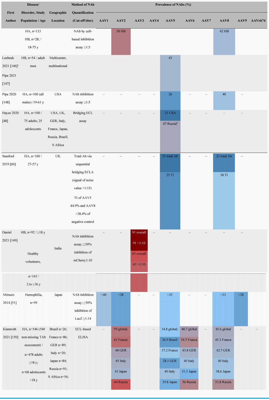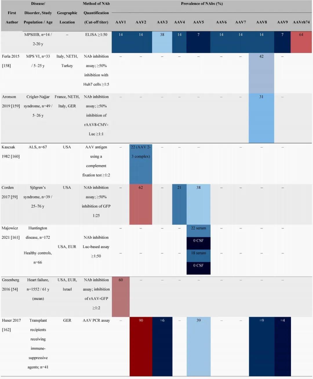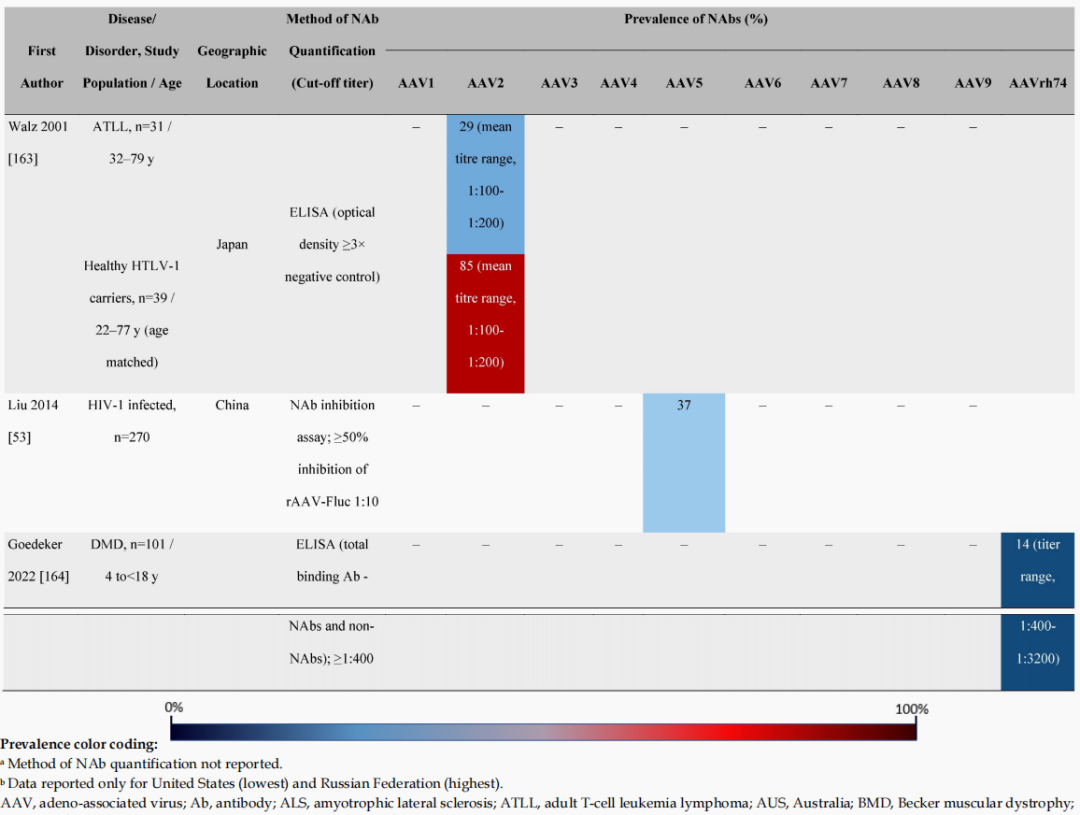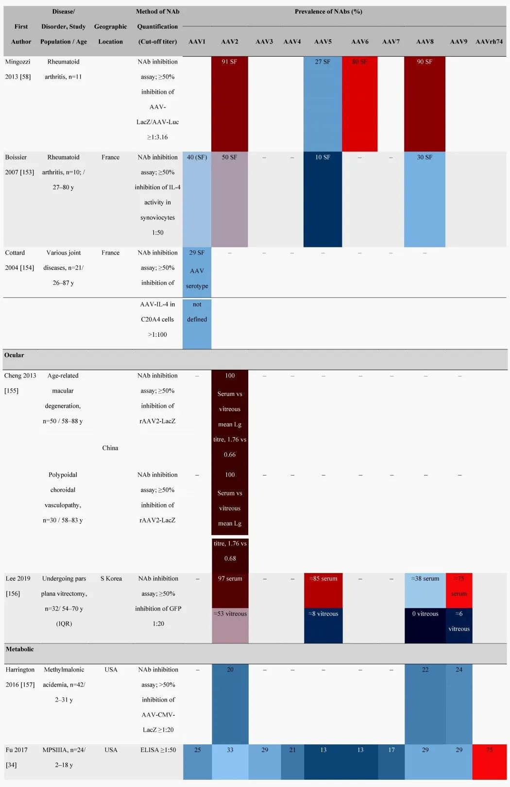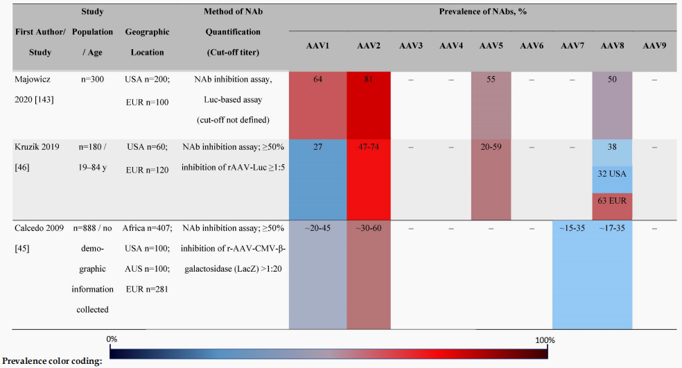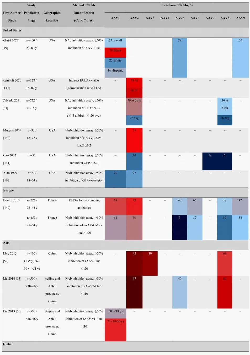 种族差异。在美国的一项研究中,黑人和西班牙裔个体对大多数AAV血清型的NAbs流行率较高。对来自10个国家的非基因治疗试验参与者的研究表明,亚洲人的血清流行率比非亚洲参与者更高。