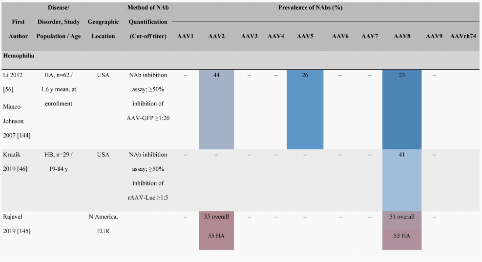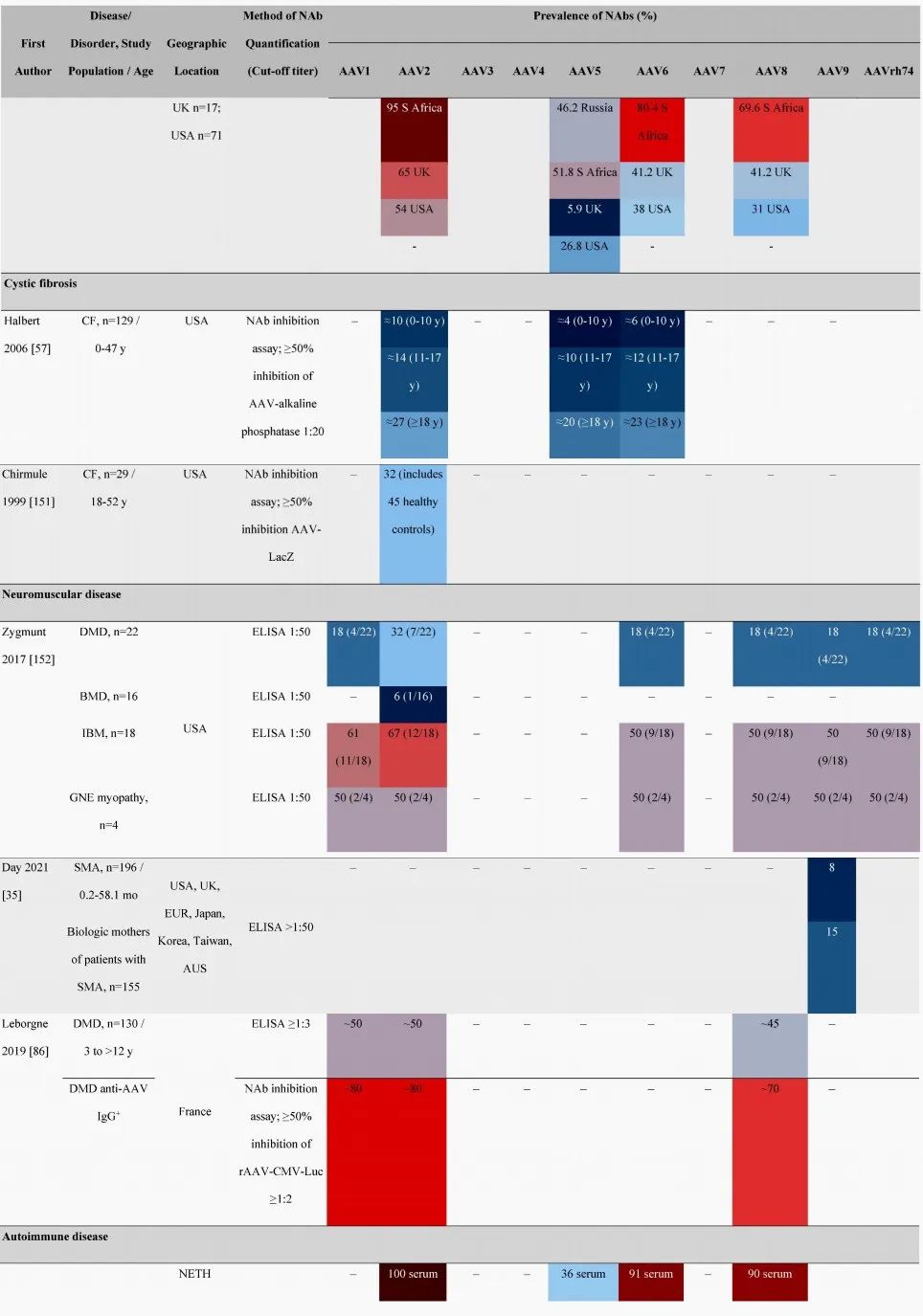 疾病状态AAV NAbs血清流行率在疾病状态与健康人群之间存在显著差异(表3)。这种差异可能受疾病性质和/或接受的治疗的影响。尽管研究中确切比率可能不一致,但血清流行率的总体趋势是相似的。例如,抗AAV2 NAbs在血友病、囊性纤维化、类风湿性关节炎等疾病状态中都较为常见。在一项关于接受血浆来源血液制品的研究中,发现接受血浆制品的A型血友病患者中抗AAV8 NAbs有所增加,以及接受丙型肝炎治疗的患者中抗AAV5和抗AAV8 NAbs有所增加。