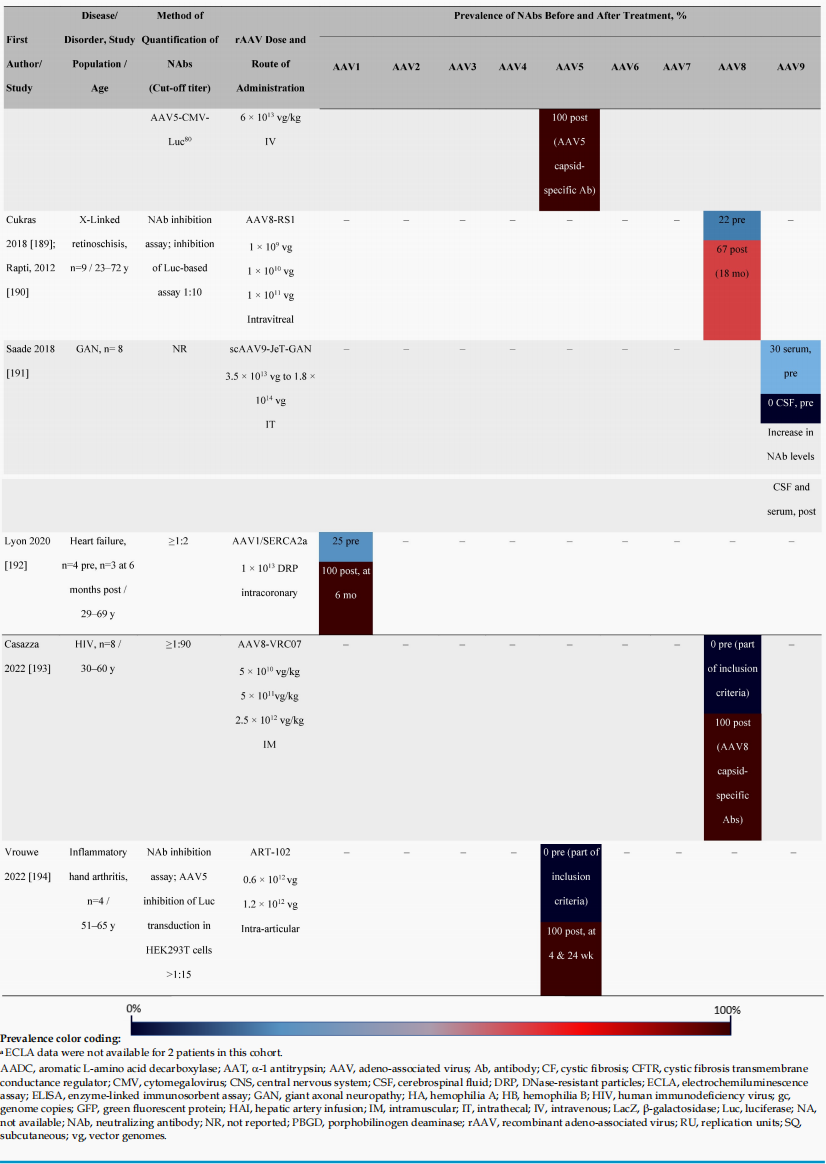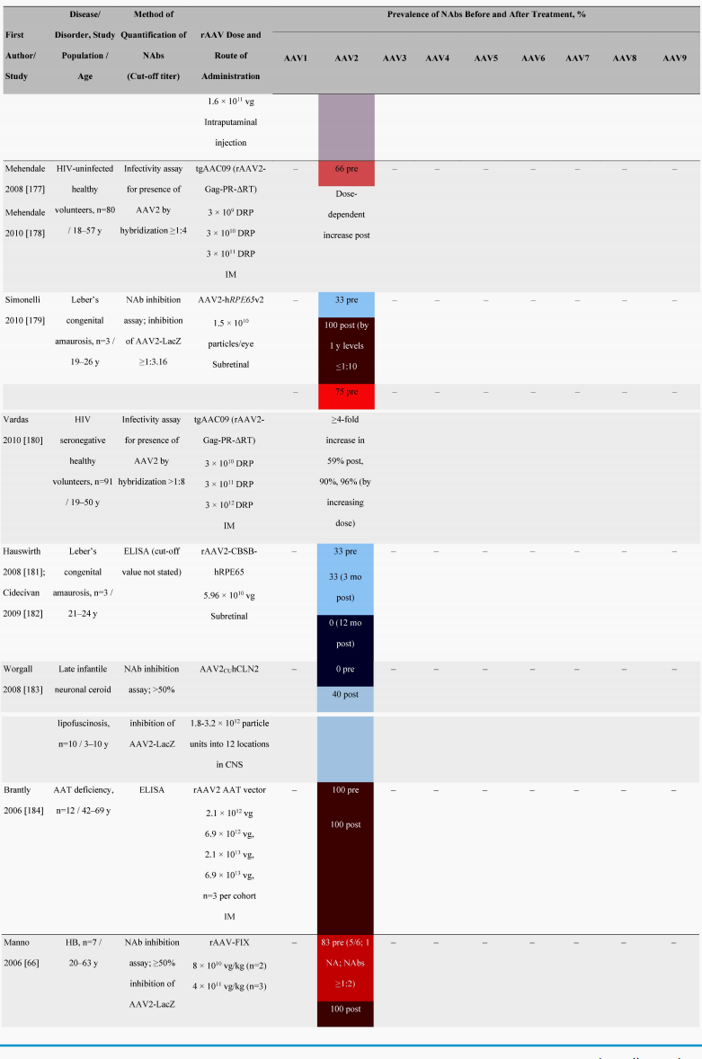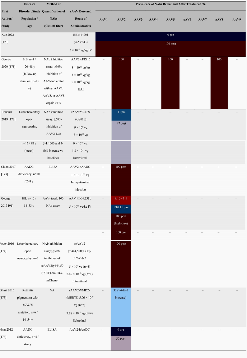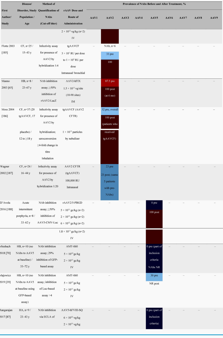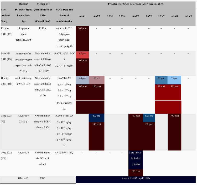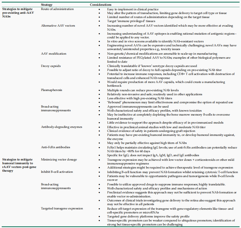 鉴于全球大多数人口已接触AAV,并且可能对特定AAV血清型具有高水平的预先存在的NAbs(表3),开发减轻风险的策略,并且扩大基因疗法适用患者人群(表5)非常重要。