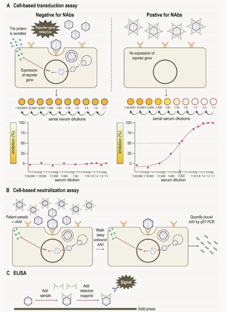 目前有几种方法用于检测抗AAV NAbs,包括基于细胞的检测和酶联免疫吸附试验(ELISA)(图4)。这些方法尚未完全标准化,通常需要根据正在研究的AAV血清型和/或转基因进行调整。基于细胞的检测方法,如转导抑制检测,通常使用报告基因来测量转导水平。这些方法通过测量报告蛋白的活性来评估NAbs对AAV载体转导的抑制能力。这种方法的优点是使用了与基因治疗载体中相同的AAV衣壳,重现了临床环境。然而,输出(例如,转导抑制50%)可能与生物学上相关的患者反应无关。另一种常用的检测方法是中和检测,它测量AAV载体与目标细胞的结合能力。中和检测通过测量报告蛋白的活性来评估NAbs对AAV载体结合的抑制作用。由于许多基于细胞的检测方法耗时,因此开发了使用实时定量逆转录聚合酶链反应(qRT-PCR)方法而不是报告基因来确定NAb滴度的新方法,并且可以快速、高效、经济地应用于所有血清型。然而,中和测定并不直接告知整体基因的递送效率或转导情况,因为未评估细胞结合后的步骤。总抗体检测,如ELISA,可以测量抗体与AAV衣壳或衣壳蛋白的结合。尽管这种方法没有直接测量中和活性,但能够捕获总抗AAV NAbs的水平。有证据表明,总抗体检测的结果通常与NAbs水平之间存在相关性,但背后的机制尚不清楚,因此需要进一步研究以确定其在AAV基因治疗中的适用性。尽管领域内普遍关注NAbs可能抑制基因的递送,但研究也表明NAbs滴度并不总是决定治疗成功与否的关键因素,在患者选择和治疗策略上可能需要更加灵活和个体化的考虑,另外,可靠的体外检测方法用以指导患者选择和临床管理也非常必要。